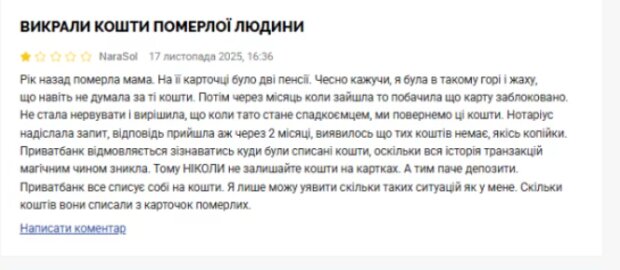 Жительница Украины сообщила, что «ПриватБанк» неожиданно обнулил остаток средств на пенсионном счёте её покойной матери, не предоставив никаких объяснений по поводу исчезновения средств.