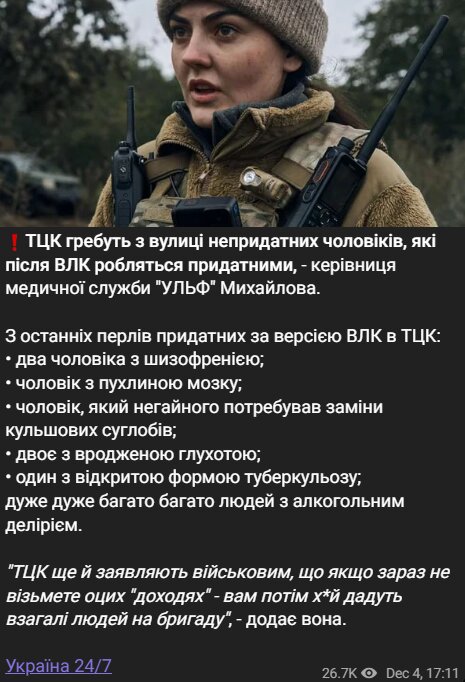 По словам начальника медицинской службы «УЛЬФ» Михайлова, ТЦК и СП продолжают принудительно мобилизовать мужчин с улицы, которые не должны считаться годными к службе, но, тем не менее, проходят военно-врачебную комиссию.
